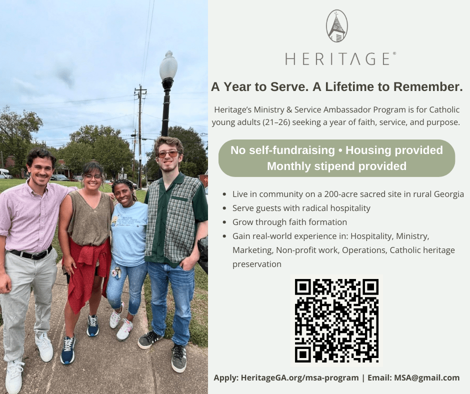 Ministry and service ambassador missionary (paid internship) opportunity at Heritage. For young adults ages 21-26. We are now recruiting for the period from September 1, 2026, to August 31, 2027. See the attached flyer for more information.